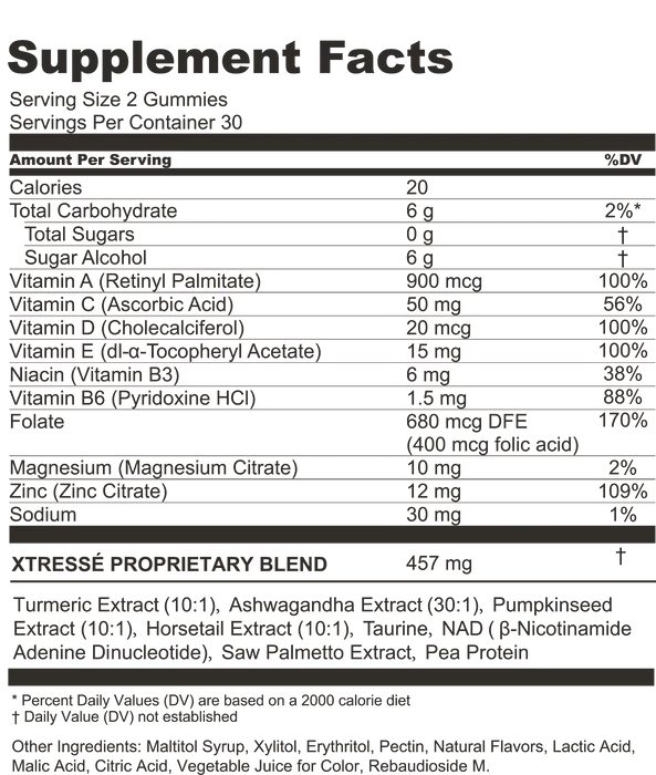 Xtressé™ Nutrient Gummies is a nutritional supplement designed to support hair follicle health on a cellular level. Developed by a leading panel of dermatologists and hair restoration experts, Xtressé ™ is powered by a modern, proprietary X3-Bioactive™ blend born from regenerative medicine. Xtressé™ nutrient gummies are formulated to support women’s health with important micronutrients like vitamins C, D3, E, magnesium, and zinc, along with powerful regenerative compounds like NAD and taurine, and hair restorative ingredients like pumpkin seed extract and saw palmetto.